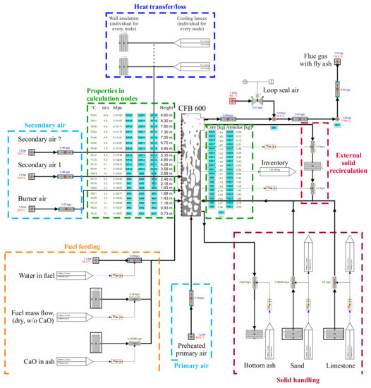 The core of the APROS model of the pilot plant is the circulating fluidized bed reactor. Figure 4 shows the process diagram of the net of the CFB furnace including air supply, solid handling, cooling lances, insulation and the solid recirculation system. The core of the model is the fluidized bed module of the APROS simulation software. It is based on a 1.5 D core annulus approach. This allows the modelling of a typical circulating fluidized bed flow pattern, in which the particles flow upwards in the core region and downwards in the annulus near to the wall. The fluidized bed module is separated into 20 calculation nodes. Ten types of materials are considered in the riser (three fluids: air, flue gas, water and seven solids: solid fuel, sand, limestone, calcium sulfate, lime, char, ash). The solid recirculation to the riser (in the experiment by the cyclone, standpipe, and loop seal) is modelled with a solid split block (cyclone) and a heat structure module (standpipe and loop seal). In the experiments, the air is injected into the loop seal to maintain fluidization of the solids. This air mainly flows to the standpipe, heats up, mixes with the flue gas and leaves the reactor through the cyclone. To reproduce this behavior, the loop seal air is mixed with the flue gas after the cyclone at a temperature of 300 °C. The heat that is required to increase the temperature of the air from 25 °C to 300 °C is taken into account, by withdrawing exactly this amount of heat from the recirculating solids. Solid fuel is injected to the riser at 0.481 m, while the fuel is separated into three components before injection: water/moisture, lime, and the rest of the fuel (dry fuel without lime). Water is separated from the fuel to avoid numerical instabilities according to the user manual of APROS. Lime is supplied separately to take into account the desulfurization reaction (). The individual mass flow rates of the three components are calculated based on the ultimate and proximate analyses of the fuel, see Table 3.