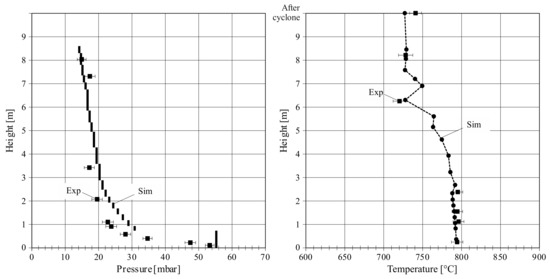 Figure 5 shows the pressure profile along with the furnace height during the long-term steady-state test with 845 kWth load. The average velocity according to the description in Section 2.2 is calculated to 4.2 m/s. In the model, the pressure drop in the freeboard is overestimated indicating that the entrainment is higher in the simulation compared to the experiment. The hydrodynamic conditions influence the chemical reactions, the heat transfer, and the temperature development in the furnace. Further improvements of the model are therefore useful to achieve better agreement in future studies—e.g., the interface density parameter can be set to smaller values. In this work, the interface density is already set 2 times smaller than the density in the splash zone. Therefore, it was chosen not to make the parameter even smaller, to have an appropriate compromise between the accuracy of the model and the physical foundation of the interface density. The agreement between experimental data and simulation is good both in terms of the total pressure drop and the reproduction of the typical CFB pressure profile. The figure also shows the standard errors for the experimental data calculated from the standard deviations in the measurement signals and the uncertainty of the measurement devices.