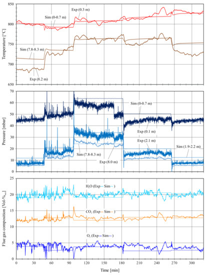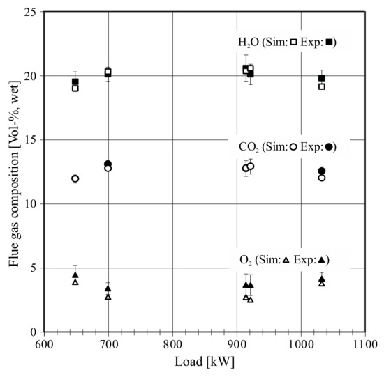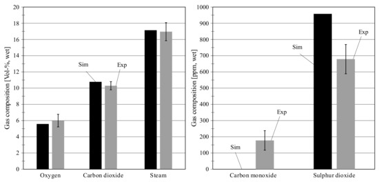 The flue gas composition is presented in Figure 6. On the left-hand side, the main gas components O2, CO2, and H2O are shown. The standard errors are presented, taking into account the measurement device uncertainty and the standard deviation of the fluctuating measurement signal. The simulation agrees very well with the experiment. Simulation results are always within the standard error of the experiment and the relative deviations are very small. Considering that the composition of the fuel is subject to fluctuations during the experiment, the agreement is considered very high.