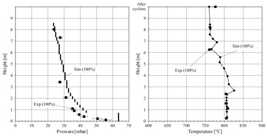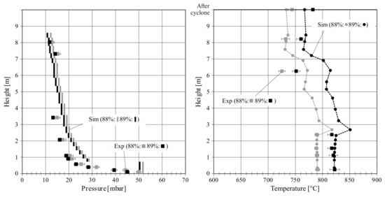 The hydrodynamic conditions in a CFB furnace depend on the load, the bed material properties, the fuel, the combustion air, the heat exchangers inside the furnace, and other parameters, such as the insulation of the furnace. All these parameters are considered in the presented APROS model. The temperature and pressure profiles are a suitable way to validate a process model in terms of the hydrodynamics. Figure 7 shows the pressure and temperature profile of the 100% load case (1032 kW) with a calculated average velocity of 4.60 m/s. The agreement between experiment and simulation is very good for the temperature profile. The bed temperature, as well as the temperature development along the reactor and the temperature at the riser top in the simulation, are within the standard errors of the experimental data. As in the steady-state case, the post-combustion in the cyclone does not happen in the model. Therefore, there is a temperature deviation of about 20 K between simulation and experiment for the temperature after the cyclone. The pressure profile shows greater deviations than the temperature profile. The overestimation of the pressure drop in the lean zone is similar to the steady-state test. However, the total pressure drop and the slope of the pressure profile in the upper reactor is still in good agreement.