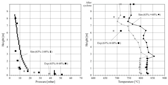 The hydrodynamic profiles of the tests with 63% and 68% load are illustrated in Figure 9. The calculated velocities are 2.78 m/s (63%) and 2.88 m/s (68%). In the experiment, there is only a minor pressure drop along the lean zone of the riser, while the simulation results still show significant entrainment. As discussed before, the model parameter interface density, which largely influences the entrainment, is kept constant for validation purposes. In the experiment, on the other hand, the density in the splash zone is slightly decreasing at lower loads (58.2 mbar at 82% load and 48.2 mbar at 63% load). It is therefore reasonable, that the deviation between the pressure profile of the simulation and the experiment may get worse at lower loads. The model gives a good indication of the total pressure loss of the experiment, even if the deviations are greater than at higher load.