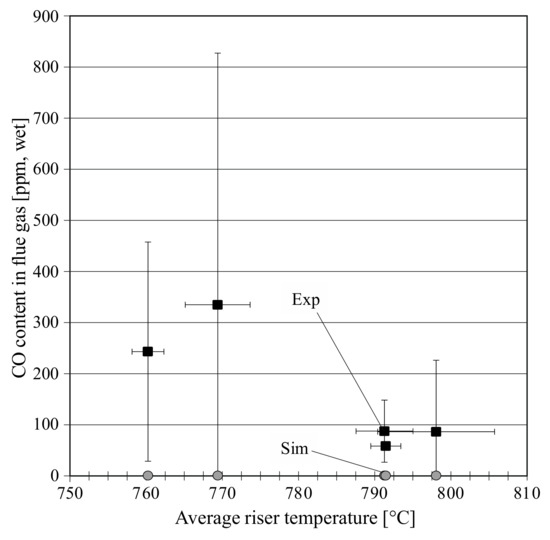- The CO concentration increases at lower loads due to decreasing temperatures in the freeboard and an imperfect mixing of air and burnable components in the riser. The model neglected this imperfect mixing and was not able to show the incomplete combustion at low loads/temperatures.