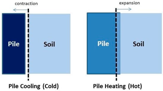 One of the concerns in energy pile design relates to the expansion and contraction of the pile caused by temperature changes. As shown in Figure 1, it can be assumed that the tightness of contact between the soil and the concrete decreases when the pile contracts. As a result, the heat transfer across this interface could become inefficient. Conversely, in the pile heating period, the concrete pile body is hotter than the soil, and thus the pile expands and causes the heat transfer coefficient to increase.