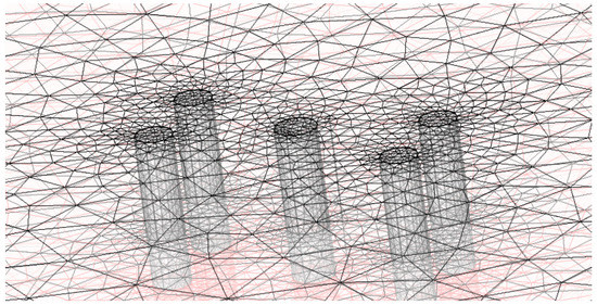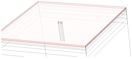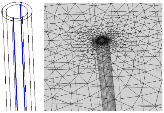 The model and mesh for the Shell Centre case is shown in Figure 8. A GSHP loop was simulated as a linear heat source with flow velocity. The whole model contained 177,632 elements. The boundary conditions applied in this model included: undisturbed ground temperature of 13 °C, ground thermal conductivity of 2.3 Wm−1K−1 and concrete thermal conductivity of 1.7 Wm−1K−1. The input liquid temperature was applied as the monitored values. The heat transfer coefficient at the concrete–soil interface (outer surface of the energy pile) was adjusted.