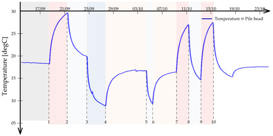Optical Fiber Sensors (OFS) were installed in the test energy pile and in the borehole in order to collect temperature and strain data. The details of how this instrumentation was embedded within the test pile and borehole can be found in [17]. Optical fibers enabled continuous distributed strain and temperature profiles to be measured, instead of the point measurements taken by more well-known equipment such as strain gauges. This technology is, therefore, ideal for monitoring the performance of piles. Thermistors (in the vibrating wire strain gauges) were also installed in the test energy pile to compare to the data measured by the OFS. VWSG thermistors that were located at the depth shown in Table 1, which shows how the temperature of the test pile changed over time at 9 m below ground level (bgl), and highlights the main activities carried out during the trial. The strain and mechanical results were analyzed by [17].