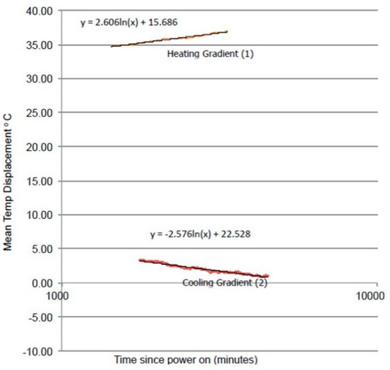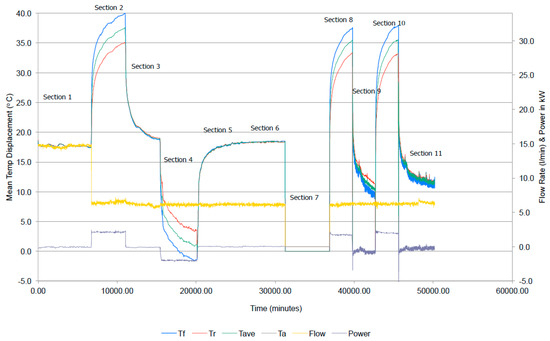 The TRT results are shown in Figure 6 and Figure 7. In Figure 6, the field temperature data are recorded. The blue and red curves represent the inlet and outlet temperature profiles at the two ends of the loop. The green curve shows the average temperature which is calculated for the TRT. The yellow and purple curves at the bottom of the figure mean the flow rate and power injected into the energy pile. The average temperature curve (green curve) is plotted against the logarithm time value (Figure 6). Following the classic calculation, the thermal conductivity of the whole energy pile has two values in the heating mode and cooling mode circles. In the heating mode it is calculated as 2.34 Wm−1K−1, while in the cooling mode period it increases to 2.37 Wm−1K−1. The difference is small and can be ignored in the engineering project, but in this study, it is taken into account to investigate the heating/cooling mode effect to the energy pile.