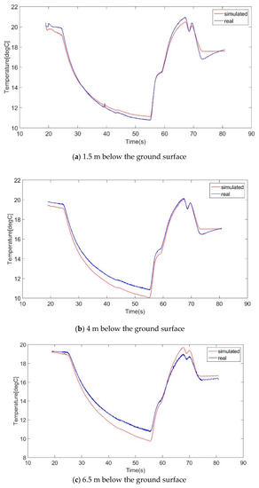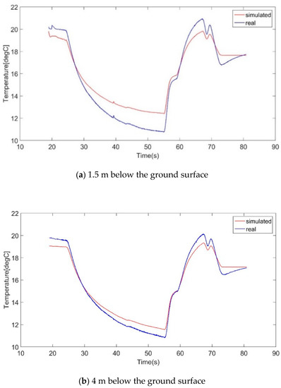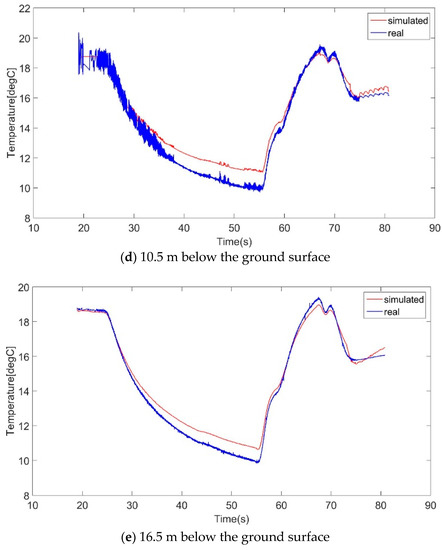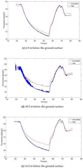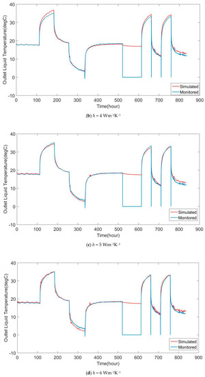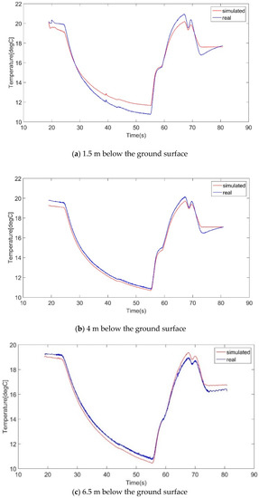 The heat transfer coefficient value across the concrete–soil interface was adjusted from 3 to 6 (Wm−2K−1). Figure 13 shows that when h = 6 Wm−2K−1, the curves match each other in the three heating mode sections, while h = 4 Wm−2K−1 makes the curves matched at the cooling mode section. Therefore, the hypothesis described in Methodology is supported in this case.