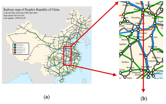 Profile of bridge–embankment transition section (unit: m): (a) China’s medium- and long-term railway network planning (https://upload.wikimedia.org/); (b) a bridge transition section of Wuhan–Guangzhou high-speed railway; (c) a road bridge transition section in Xianning.