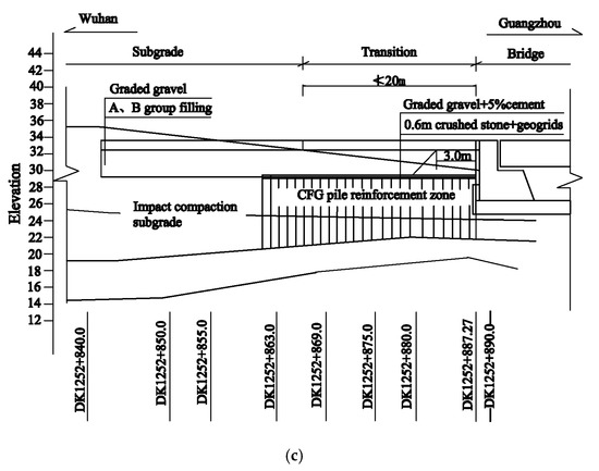 By 2020, China’s high-speed rail operating mileage has reached 35,000 km (Figure 1a), of which Wuhan–Guangzhou high-speed railway (Figure 1b) is the first high-speed railway with a speed of 350 per hour. The site in this paper is a filled bridge–embankment transition in the Wuhan–Guangzhou high-speed railway (HSR), covering from DK1252+840 to DK1252+888.27, with a total length of 48.27 m and the embankment height of about 3.5 m. The longitudinal aspect of the entire test section is shown in Figure 1c. In this section, the foundation is reinforced by cement fly-ash grave (CFG) piles with a pile diameter of 0.5 m; the transition section is with a triangle shape. The top of the pile is paved with 0.6 m-thick gravel cushion, and a layer of geogrid with the ultimate tensile strength not less than 80 kN/m is paved inside.