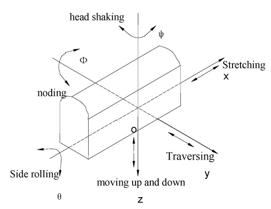 High-speed trains are composed of locomotive vehicles and passenger vehicles. Various types of vehicle bogies have been designed according to different speed grades in the world. The fast or high-speed vehicle bogies are “three-no-structures” (no bolster, no shaking table and no side bearing). However, they are composed of two wheelsets, frame and secondary suspension from the perspective of energetics. The vehicle body, bogie and wheelsets are often regarded as rigid bodies, for example, the position of the vehicle body in space can be determined by three mutually perpendicular coordinate axes x, y and z of the center of gravity at point O with 6 degrees of freedom, such as stretching, traversing, moving up and down, side rolling, nodding and head shaking (as shown in Figure 2).
