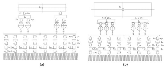 Typical vehicle–track space coupling dynamics model. (a) Passenger; (b) locomotive.