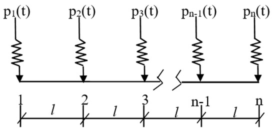 Firstly, the vehicle–track model is established based on the dynamics of the multi-rigid body, and the relationship between vertical wheel load and time is obtained through simulation calculation. Then, this force is applied to the neutral axis of rail, i.e., the node of the beam element in the finite element model of rail and under rail structure, as shown in Figure 7. At any time t, the wheel load of the vehicle moving at a constant speed is: