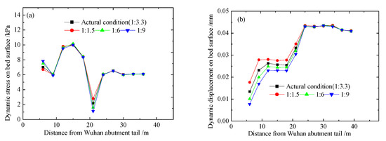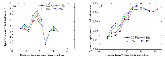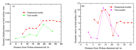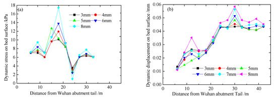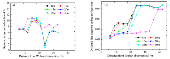 From the above analysis, it can be concluded that the maximum longitudinal dynamic stress of the bed surface reaches a peak at 18 m from the tail of the abutment, and the dynamic displacement increases with the distance from the abutment and reaches a peak at 25–30 m from the tail of the abutment.