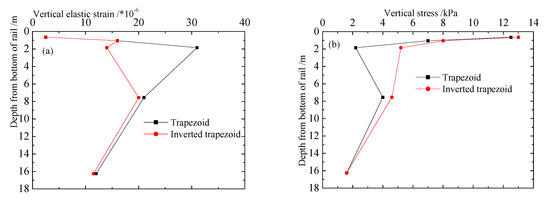 The curves of dynamic stress and vertical elastic strain in Figure 13a,b indicate that the major difference only occurs within the layer of approximately 2–7.5 m (bed and shallow subgrade). In detail, from Figure 13a, for the inverted trapezoidal embankment, the vertical dynamic elastic strains of the bed bottom and the subgrade are smaller than those of the trapezoid. The response of dynamic stress is just the opposite as shown in Figure 13b, that is: the dynamic stress of the inverted trapezoidal embankment is greater. After that, the two curves gradually coincide when the depth exceeds 7.5 m. The above phenomena, due to the rigidity of the transition section filling, are higher than that of ordinary subgrade filling and the corresponding stress has a better diffusion effect. Therefore, the analysis result of this paper considers that the structural design of inverted trapezoid is more reasonable than that of the positive trapezoid transition section.