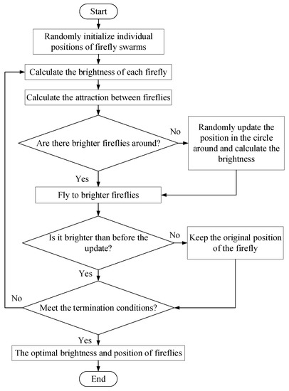 - Algorithm iteration. According to steps (2)–(4), fireflies will be updated through multiple flights until the maximum number of iterations is reached, and one or more firefly clusters will eventually be formed. The coordinates of the brightest firefly represent the optimal solution that the algorithm finds in this space.