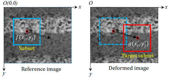 There are two methods to analyze the image correlation: one is to use the cross-correlation (CC) criterion, and the other is to apply the sum of squared differences (SSD) criterion. These methods measure the brightness values of spots on the image for analysis [18,19]. The CC criterion uses the maximum value of the highest correlation from the calculation. In contrast, the SSD criterion uses the minimum value of the highest correlation [20,21,22]. Table 1 shows commonly used cross-correlation criteria and their definitions, and Table 2 shows those for the sum of squared differences criteria. Two more equations can be adopted for each criterion by averaging or normalizing the brightness distribution. The equations for zero-normalized cross-correlation (ZNCC) and zero-normalized sum of squared differences (ZNSSD) have a mutual conversion.