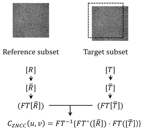 The conventional image correlation method uses a reference subset image as a kernel. Convolutions are operated from initial guess area for reference subset image coordinates based on image change. The strain is calculated by the coordinate change detection, which is the highest coordinate for correlation. Every coordinate in reference and all deformed images must be compared and calculated to obtain accurate displacement positions, so this process requires a lot of iterations. Thus, this conventional DIC method needs quite a long time to measure. However, the FFT-based DIC method compares the correlation from reference subset images to deformed subset images along the frequency range. That means that the initial guess does not need to be determined, and it also does not need iterations. It is possible to analyze DIC even faster than the conventional method. Figure 2 is the matrix calculation diagram to obtain CZNCC correlation criteria by the FFT method.