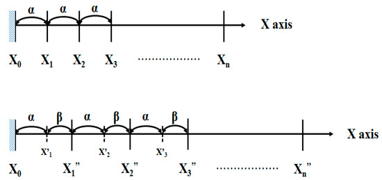 Figure 3 shows the displacement variation of the solid material by a uniaxial load. Material deformation is not dependent on each position but on adjacent area, because material is a continuum. This changes along the same direction of applied load, as mentioned above. Therefore, the same amount of deformation (β) is assumed for the same length (α) by a uniaxial load: then, Equation (8), as follows, is obtained.