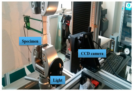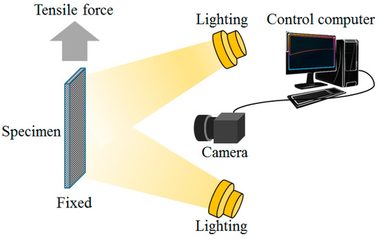 Figure 12 shows the measurement system configuration for tension test, and universal testing machine was used. The DIC system obtained image data of specimen deformation from the camera during the tensile test. The specimen dimensions for the fabricated nanofiber mat are shown in Figure 13. The setting region of interest on the captured images allows for saving analysis time by eliminating unnecessary regions, because the DIC system analyzes the total area of the pictures. The cross-head speed of the testing machine was maintained at 3 mm/min of tension. The resolution of the load cell used in the experiment was 0.001 N, and it was sufficient to measure the deformation of the nanofiber mat specimen. Force and displacement were measured every second. A maximum force of 0.085 N was applied for about 7 min during the tensile test.