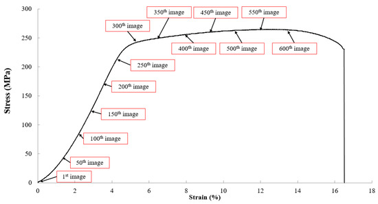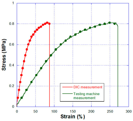 Figure 14 is the strain–stress curve from two measurement systems; one is the DIC measurement and the other is the universal testing machine with the load cell. This test specimen was elongated continuously before the fracture. Testing the machine gave the strain data by calculating the following equation: