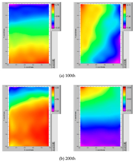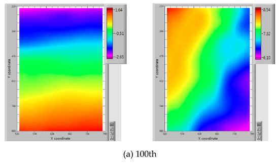 The results of displacements distribution by the conventional DIC algorithm. (Left: x-direction, Right: y-direction deformation result).