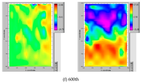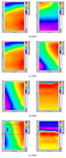 Figure 7 shows the strain–stress curve from the load cell and extensometer data. Two kinds of calculated results were compared with each other from the conventional DIC system and our new feedback-added FFT DIC system. The images of x-deformation and y-deformation were analyzed to compare the two different methods. The images of the 100th, 200th, 300th, 400th, 500th and 600th frames were analyzed as follows. One frame of the image was saved per second. Thus, the shown images are from the start of the process to 10 minutes. The following images are not for the whole size of the specimen, but for the interest area of 6916 pixel points, which is composed of a width of 52 pixels and a height of 133 pixels.