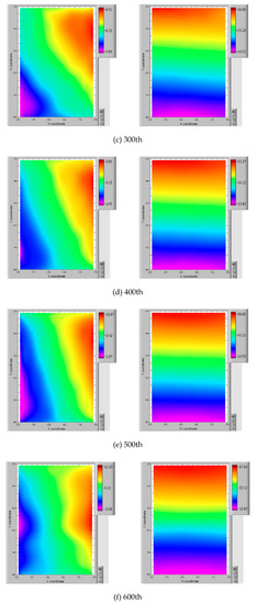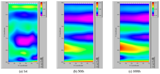The images from (e) to (f) in Figure 8 show it was impossible to trace the correlation point with higher strain for conventional DIC analysis. This is because the measurable displacement range is limited by subset image size when conventional DIC analysis is used. The image (e) in Figure 8 shows that there was inner defect or facture, despite there being no defect or fracture in and on the specimen. The system failed to track the upper region of image (f) after (e). The images in Figure 9 show the displacement distribution along the X and Y directions with our new feedback with added FFT DIC analysis. The maximum displacement was larger than the subset image size. In addition, there were no image errors. Because pre-process was added to measure displacement by using a 20 by 20 subset image size to the new analysis method, then this displacement result was provided as feedback for the extracted image coordinate of the deformed region. Therefore, our new analysis system demonstrated larger strain measurement for material deformation because the feedback algorithm was added, regardless of subset image size.
