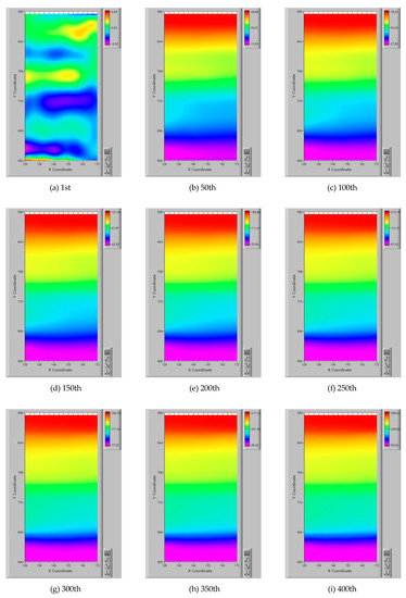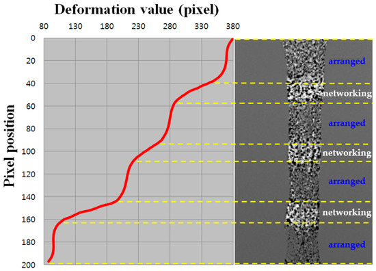 The displacement distributions in tension direction (that is y-direction) from DIC analysis are shown in Figure 15. Each displacement distribution was obtained after calculating the correlation coefficient between reference image and deformed image by DIC algorithm. Nine distributions were those of the 1st, 50th, 100th, 150th, 200th, 250th, 300th, 350th and 400th analysis results. Additionally, these nine points were marked on the strain–stress curve in Figure 14. The X and Y coordinates were the acquired image pixel coordinates for vertical and horizontal directions, respectively. The region of interest (ROI) had a rectangular area 43 pixels wide and 315 pixels high. The gage length of the specimen was 7.62 mm, corresponding to 315 pixels, so that each pixel represented 24.2 μm. Each distribution shows a higher value in upper position and a lower value in lower position, because the lower position of test specimen was fixed and upper position of that was moved upward. The first distribution shows the displacement of about 0.1 pixel, corresponding to 2.42 μm. The 50th has the maximum value of about 920 μm—this displacement value increased with time to about 8.93 mm before fracture at the 400th. The displacement distributions from the 50th to 400th were divided into four or six regions by color, because the nanofiber mat had not only a randomly arranged area but also a uniformly arranged area, repeatedly. The uniformly arranged area shows high displacement, which is brighter than the regions in the random area, while the randomly arranged area has low displacement in the line profile of Figure 16.