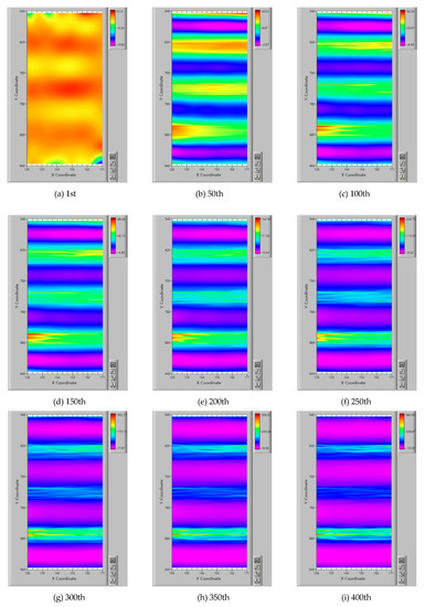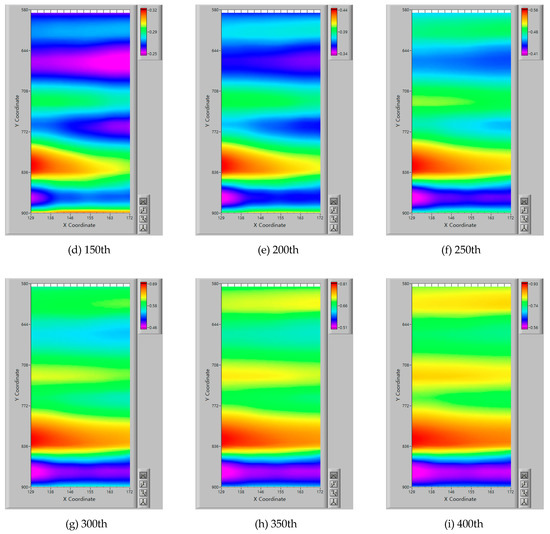 There is an easy way to detect the weakest part of the specimen. There must be the maximum displacement at the weakest section. So, the displacement gradients along the Y direction were calculated and are shown in Figure 18. Another ROI, 47 pixels wide and 394 pixels high, was used to show the displacement gradient distribution for the broadened area. Eight figures (b–i) reveal that longer displacement parts were located at the arranged sections of the nanofibrous tensile specimen.
