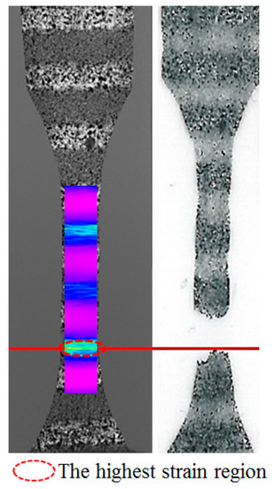 The position of test specimen fracture was compared with the displacement gradient distribution result of the DIC method in Figure 19. The fracture picture of the specimen is shown on the right, and the DIC displacement gradient distribution image is overlapped on the test specimen image on the left. The highest strain value line shows an exact agreement with the fracture line on the position on the specimen.