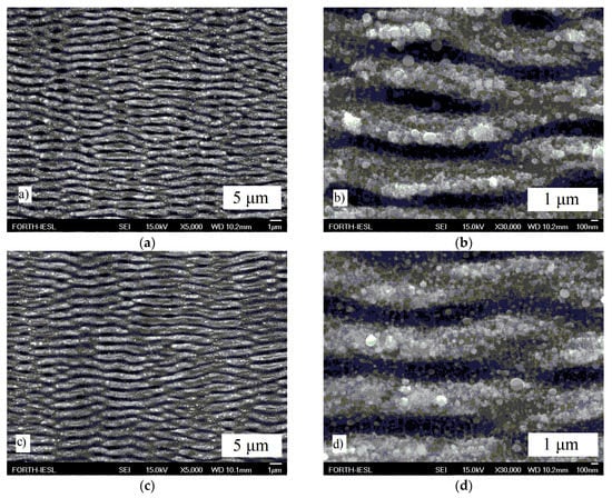The wetting properties of the surfaces were influenced both by their chemical composition and by their morphology—i.e., corrugation [,]. The influence of the different chemical composition is represented by different materials of the topmost layers, while the influence of the morphology is caused by the interaction with the laser. The role of the more complex multilayer structure is represented by using 8×(Zr/Cr/Ti) samples. Exposing the samples to the fs laser beam generated LIPSS on the surfaces, shown in Figure 1. LIPSS on the surface of 15×(Ti/Zr) on Si are shown for two magnifications in Figure 1a,b. LIPSS on the 8×(Zr/Cr/Ti) are presented in Figure 1c,d, and also for two different magnifications. In addition to wavy-patterned LIPSS, the occurrence of nanoparticles with dimensions less than the periods of LIPSS, is also noticeable.