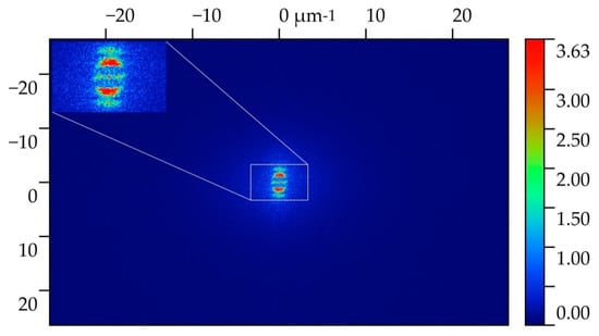 SEM results (Figure 1) reveal that there is a periodicity in the pattern, but the 2DFFT processing of LIPSS micrograph from Figure 1a presented in Figure 2 provides better insight. The appearance of the maxima (inset in Figure 2) shows that the structures are periodic. A clear distinction in the maxima indicates that LIPSS are highly regular, due to the multi-layer structure. By the convenient combination of the materials, the existence of the underneath layer produces a steep change in the layers’ temperatures and enables the transfer of thermal energy through the interface and away from the interaction zone [].