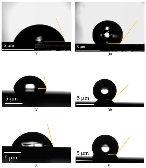 While LIPSS are anisotropic, the isotropy of the contact angles was not investigated. The direction of LIPSS (sample orientation) relative to the direction of recording (camera orientation) was arbitrary for each sample and undetermined. No significant difference in the left and right contact angles can be seen in Figure 3b,d,f, meaning either LIPSS and recording directions were set parallel by chance for each sample or the droplets were not significantly anisotropic. To match the directions of LIPSS and camera recording to be parallel by chance is less likely, indicating that the droplets are not significantly anisotropic. Though the anisotropy of the surface structures influences the anisotropy of the CA, with the smaller width of the structures (ripples itself), the influence is smaller []. Very small widths of the ripples (~700 nm) in the presented experiment suggest that the influence of the structure anisotropy (LIPSS) to the droplet anisotropy is not significant.