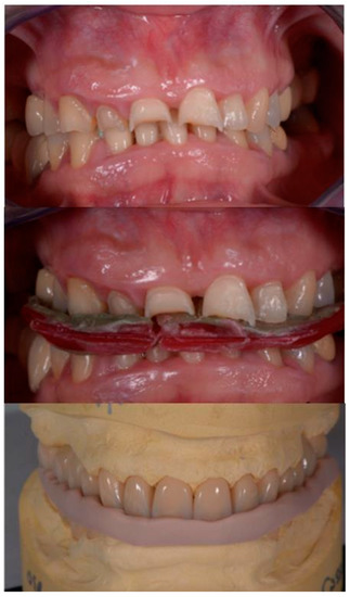 - Fabbri, G.; Cannistraro, G.; Pulcini, C.; Sorrentino, R. The full-mouth mock-up: A dynamic diagnostic approach (DDA) to test function and esthetics in complex rehabilitations with increased vertical dimension of occlusion. Int. J. Esthet. Dent. 2018, 13, 460–474. [Google Scholar] [PubMed]