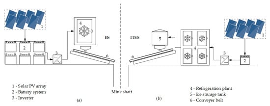 Relevant works on this domain are the works that discuss about employing solar technologies in mine sites and the energy storage technology that they opt for. Deployment of solar energy in mining is relatively a new topic, contrary to residential and commercial sectors. The first MW-scale solar PV system in a mine site was installed in 2012 at Cronimet’s South African chromium ore operation generating up to 1.8 GWh of energy per year []. A historical breakthrough of solar penetration in mining took place in 2013 after the installation of a 10-MW solar thermal plant in a Copper mine in the Atacama Desert. Owned by Minera El Tesoro, the plant replaced more than 55% of the diesel fuel consumed in the heating process for electro-extraction of copper []. Musselwhite mine in Canada, Chevron molybdenum mine in the USA, and few other mines in Chile are utilizing solar energy in mine sites. As a matter of fact, many of the world’s remote mine activities are located between 35 latitude north and south where the sun is intense and reliable []. An ice storage technology run on solar PV can aid in reducing the cooling plant maximum capacity in a Canadian mine []. Baig et al. [] recommends four mine sites in the Northern Territory of Australia for Concentrating Solar Panel installation at the regional cluster level. Kim Trapani demonstrated the potential of floating solar panels in a remote McFaulds lake in Ontario to generate electricity of 400 MW that could provide electricity to 16 mines in this area []. A comprehensive literature review suggests that the solar technology is penetrating slowly but surely in the mining industry. However, most of the current and proposed applications include heating and electricity generation while only two publications are discovered for cooling [,].