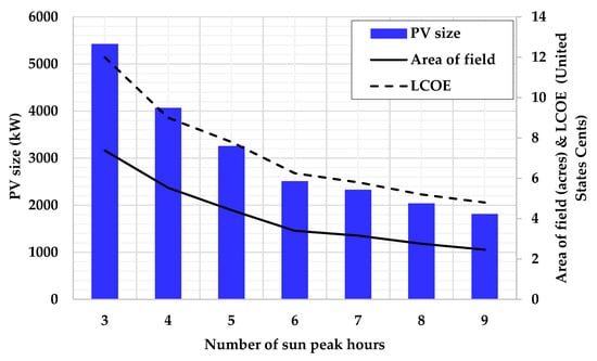 The total power drawn by the compressor and its accessories is 443 kW, which provides a cooling capacity of 1.2 MW with a COP of 2.8. To run this device merely with solar system, nominal array output of 2.5 MW is needed for a place with 6-h of sun peak. Since most of the remote mines are located in high solar intensity zones, this solar irradiation intensity is considered as a standard number and is used in analysis hereafter. Additionally, 3.4 acres of land is needed to install the proposed solar photovoltaic system. Figure 2 illustrates the design change in the solar PV system, and the corresponding change in the Levelized Cost of Energy (LCOE) and the area of the solar field required for different sun peak hours. As expected, there is a strong correlation between solar intensity, LCOE, and the area of the solar field required associated with sun peak hours. An increase in sun peak hours leads to an obvious decrease in installation capacity, LCOE, and area of installation field required.