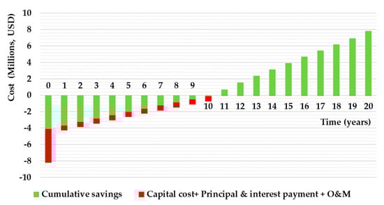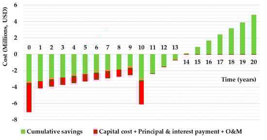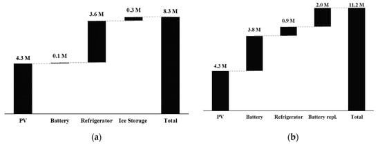 With the cost breakdown from Table 1, the total capital cost of the project is calculated. Figure 3 depicts the waterfall chart showing the capital cost requirement for two different scenarios. The total initial investment for solar panel and its accessories is found to be USD 4.3 million including AC/DC inverter. With the battery management cost included, the capital cost of the battery system is calculated as USD 3.8 million. Considering the decrease in electrochemical performance during charging and discharging cycles of the lithium-ion battery, battery replacement is required every 10 years or after 3600 cycles []. Therefore, for the battery-based system, an additional cost is needed at the end of each 10-year operational period. This is shown as ‘battery replacement’ cost in Figure 3b. The price of lithium-ion batteries after 10 years is projected based on the available published resources [,,], and accounting the time value of money. The capital cost of a single refrigeration plant is USD 910k including installation and commission charge. The storage cost of ice is USD 32 per kWh and the total cost of the required storage system is USD 350k []. For ITES, a small amount of battery is required to supply sufficient voltage and current for the refrigerator. This number at least should be equal to the number of batteries in series given by Equation (15). However, to be on the safe side, the battery system is designed to supply continuous energy demand for half an hour. Corresponding total cost of such a designed battery system is USD 100k.