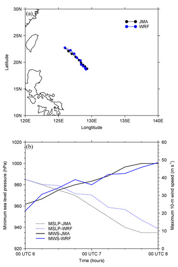 The simulated track, minimum sea level pressure, and maximum 10-m wind speed of Lekima are compared with the best-track data of JMA at 6-h resolution in Figure 1. It can be found that the simulated track of Lekima agrees well with the observation throughout the simulation (Figure 1a). The model reproduces well the intensification of Lekima during the simulated period, and achieves a lowest minimum sea level pressure of 938.8 hPa and highest 10-m maximum wind speed of 48.5 m s−1 (Figure 1b).