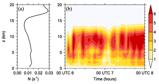 Figure 2a shows the vertical profile of the basic-state Brunt-Väisälä frequency during the simulation, which is defined as the inner domain-averaged value and reflects the static stability of the background atmosphere. The frequency is almost constant below z = 5 km, with a mean value of 1.26 × 10−2 s−1. It then decreases slowly from 1.28 × 10−2 s−1 at z = 5 km to 6.48 × 10−3 s−1 at z = 14 km, while experiences a sharp growth from z = 14 km and achieves a maximum value of 2.91 × 10−2 s−1 at z = 18 km. Thus, the heights from 14 to 17 km can be roughly treated as a transition zone from troposphere to stratosphere.