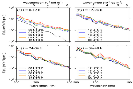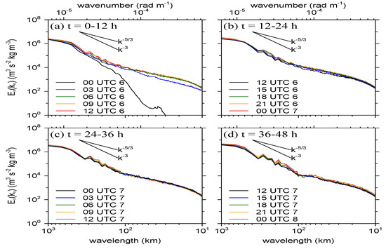 Time evolution of the horizontal kinetic energy (HKE) spectrum [Eh(kh)] averaged vertically over the troposphere for (a) 0–12 h, (b) 12–24 h, (c) 24–36 h, and (d) 36–48 h. Spectra are plotted every 3 h. The reference lines correspond to the −3 and −5/3 slopes.