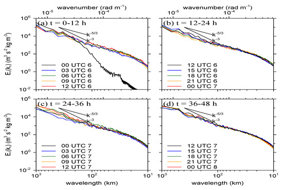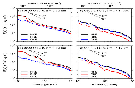 Time evolutions of the vertically averaged HKE spectra over the troposphere (z = 0–12 km) and lower stratosphere (z = 17–19 km) are shown in Figure 3, Figure 4 and Figure 5, respectively.