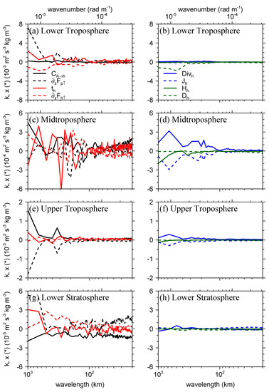 Although there is weak upward at wavelengths (wavenumbers) slightly greater (smaller) than 100 km (2π × 10−5 rad m−1), the lower troposphere is primarily the net inflow layer of downward . Meanwhile, the upper troposphere is always the net outflow layer of and the lower stratosphere is the net inflow layer of upward . Consequently, the term (black shaded lines in the left panels of Figure 7) makes clear positive, negative, and positive contribution in the lower troposphere (Figure 7a), upper troposphere (Figure 7e), and lower stratosphere (Figure 7g), respectively. The midtroposphere, however, is both the inflow and the outflow layer of , depending on the wavelength; thus the contribution of with wavelength over this layer is complicated (Figure 7c).