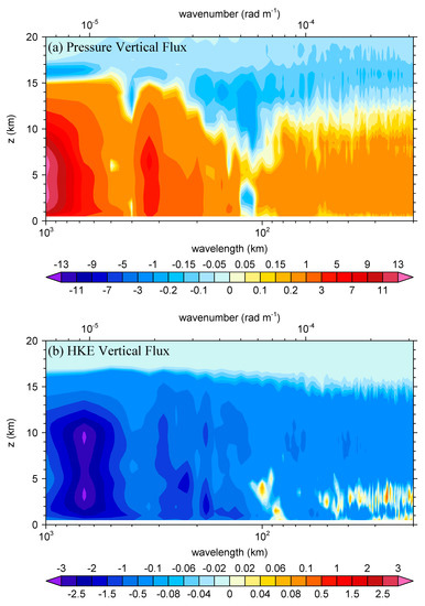 The pressure vertical flux corresponds to the flux of IGW energy at lowest order; thus, the divergence term can reflect the effect of vertical transportation of IGWs on the budget of HKE. The wavelength–height distribution of is shown in Figure 8a, and note that a positive (negative) means a downward (upward) flux. On the whole, is upward in the lower stratosphere and downward in the troposphere at various scales, implying the domination of IGWs which occur in the upper troposphere and then propagate to higher and lower layers.