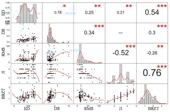 After reviewing the previous literature [14,18,72,73], a roadways broken rock zone (BRZ) database with 181 datasets consists of embedding depth (ED), drift span (DS), surrounding rock mass strength (RMS), joint index (JI) and broken rock zone thickness (BRZT) was collected. For the deamination of JI values, the overall, block, layered, fragmented and loose rock mass were assigned a value of 1 to 5, respectively. For the determination of BRZT values, some mines in this database use the ultrasonic detection method, and some mines use the geophysical detecting radar method. Among these 181 datasets, there are 154 datasets were collected from the roadway with depth of less than 800 m. Considering that there is a zoning rupture phenomenon when the excavation works enter deep mining, the concept of broken rock zone (BRZ) cannot fully describe the rapture of rock around the roadway [4]. In China, most scientists think that deep than 800 m can be judged as deep mining [74,75], so only the datasets (see Figure 3) with depth less than 800 m were analyzed in this paper. In Figure 3, the asterisks means the significance levels of the correlations, the more asterisks, the smaller the p value.