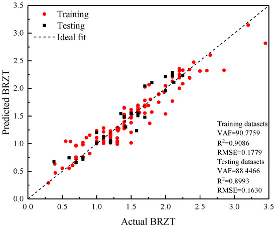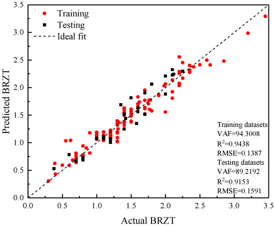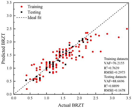 By using the above formula, the predicted BRZT can be calculated and the predicting results with VAF of 76.2155, R2 of 0.7639 and RMSE of 0.2973 for training datasets and VAF of 88.6696, R2 of 0.8899 and RMSE of 0.1678 for testing datasets can be found in Figure 4.