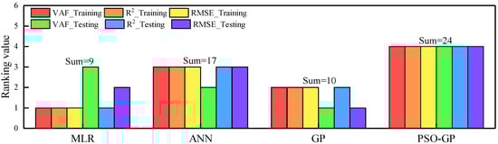 As shown in Figure 8, predicted results provided by PSO-GP are most consistent with the actual measurement results, and the best predictive performance was also proved by the highest total ranking values of 24 by using Zorlu’s method.