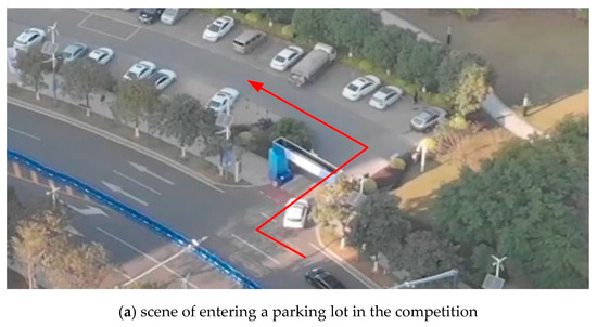 There is a scene of entering a parking lot through continuous right-angle turns in the competition, as shown in Figure 14a. Figure 14b,c show the reference trajectory and the curvature of the trajectory. It can be seen that the curvature of the trajectory increases rapidly when making a right-angle turn. In order to follow the actual driving rules and guarantee the safety, the turning speed is limited to 8 km/h.