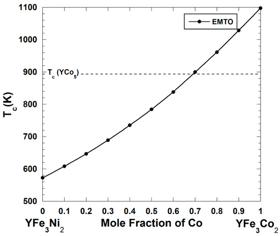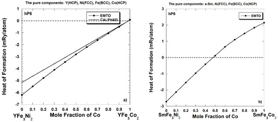 In order to understand the difference between Figure 2a,b, one needs to take into consideration several of the following arguments. Nickel metal forms the stable CaCu5-type compounds with both yttrium and samarium metals. Calculated within EMTO formalism, the heat of formation of SmNi5 and YNi5 compounds (in the CaCu5-type structure) is −18.95 mRy/atom and −22.91 mRy/atom, correspondingly, which is in accord with the experimental measurements of −23.08 mRy/atom (−30.3 kJ/mole, SmNi5, [32]) and −25.98 mRy/atom (−34.1 kJ/mole, YNi5, [32]). As we mentioned in the Introduction, the YFe5 compound as well as the SmFe5 compound (see refs. [3,4]) do not exist in the equilibrium Y-Fe and Sm-Fe phase diagrams, correspondingly, thus no experimental information about the heat of formation of these hypothetical compounds is available. However, the EMTO calculations show that that the heat of formation of the YFe5 compound is positive, +6.46 mRy/atom, and is half of the calculated heat of formation of the SmFe5 compound, +12.68 mRy/atom. As a result, the calculated heat of formation of the YFe3Co2 compound, +0.09 mRy/atom, appears to be smaller than the calculated heat of formation of the SmFe3Co2 compound, +2.15 mRy/atom [4]. The computed heats of formation of the YFe3Ni2 and the SmFe3Ni2 compounds are both negative (stable compounds), however, the absolute value of the calculated heat of formation of the YFe3Ni2 compound, |−6.20| mRy/atom, is more than twice as high as the absolute value of the heat of formation of the SmFe3Ni2 compound, |−2.72| mRy/atom [4]. As a result, the region of stability of the pseudo-binary YFe3(Ni1–xCox)2 alloys appears to be almost twice as wide as the region of stability of the pseudo-binary SmFe3(Ni1–xCox)2 alloys.