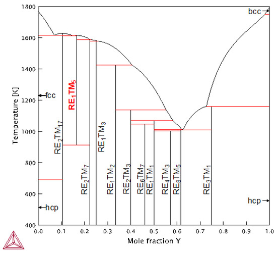 The CALPHAD method permits the prediction of phase stability and thermodynamics of multi-component systems based on the extrapolation of the phase diagram data and the thermodynamic properties of its constitutive binary and ternary systems [116,117,118]. The CALPHAD formalism consists of modeling Gibbs energy functions for each phase of the system (potentially including all elements) to reproduce the available thermodynamic (e.g., heat of formation) and phase diagram (e.g., melting point) data. Once the parameters of these functions are assessed for the constitutive systems, extrapolation (or prediction) can be made for multi-component systems. Here, we focus on heat of formation (thermodynamic property), phase diagram data (e.g., melting point, solubility limits), and CALPHAD assessment of the YTM5 compound with TM = Co, Fe, and Ni as a first step toward the establishment of a complete Y-Co-Fe-Ni database. Model parameters optimization and CALPHAD calculations are performed using the Thermo-Calc software package (2019b version) in combination with its PARROT module [119,120].