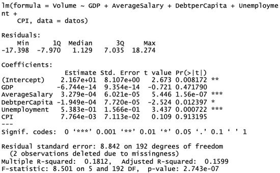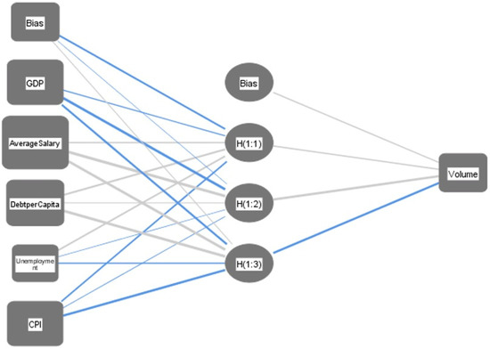 In Table 2, we summarize the most relevant characteristics of the network used. In this sense, we can observe that for the volume (dependent variable), we have used five macroeconomic variables (GDP, Average Wage, Debt per Capita, Unemployment, and CPI) that will serve as predictors.